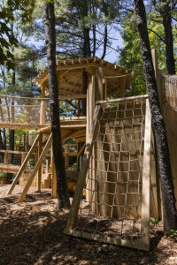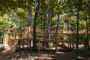 Unveiled on June 27, the Arwood Family Treehouse offers ramps, rock walls, rope bridges, and climbing ropes. The new is named for Cathy Arwood, who donated more than half the project’s cost in honor of her son Alex Arwood and daughter-in-law Kristina Arwood, who is Wesselman Woods’ Marketing and Community Engagement Director.