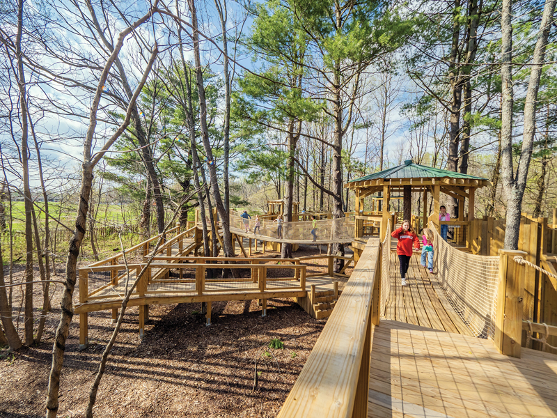 The Wesselman Woods Nature Preserve boasts the Welborn Baptist Foundation Nature Playscape, a five-acre spot for children to explore, as well as the Arwood Family Treehouse, which was 10 years in the making before opening in 2024. Kids can navigate ramps, rock walls, rope bridges, and climbing ropes on the treehouse and take in a view of the forest 12 feet above ground.