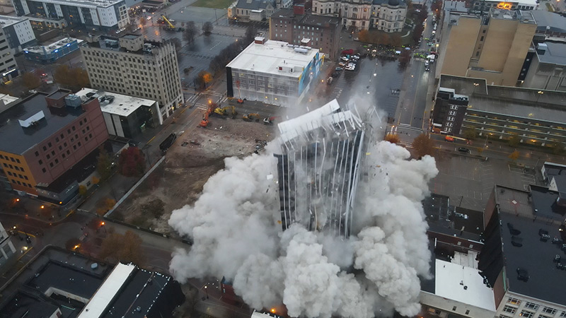 After Old National Bank moved into its current headquarters and the Petroleum Club closed its doors, 420 Main sat mostly vacant. Several renovation ideas were floated to rejuvenate the building, the most recent by Carmel, Indiana-based Domo Development, which bought the site in 2019. A post-purchase assessment determined the cost to renovate the tower would exceed any revenue it would bring it, and the decision was made to topple 420 Main and the adjacent Sycamore Building. General contractor Barton Malow of Nashville, Tennessee; Indianapolis-based demolition contractor Renascent, Inc.; and Maryland-based explosives expert Controlled Demolition Inc. worked with Evansville city and public safety officials to craft a plan to implode the 18-story tower, which occurred under a quiet morning rain on Nov. 21, 2021.