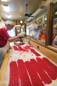 The scent of hot cinnamon pours onto the street from the exhaust fan outside Schimpff’s Confectionery. “It’s free advertising,” says Jill Schimpff, wife of fourth-generation candymaker Warren Schimpff. Open since 1891, the confectionery is one of the oldest family businesses in the country. The Schimpff family’s love of candy and their community is reflected in their pristinely preserved historic building packed with historic candy memorabilia and colorful, edible displays, as well as their stories about their favorite moments with young customers who are by now adults and may have children of their own.