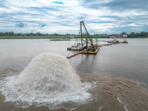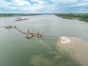 Traditionally, a USACE team — Evansville is within the Louisville, Kentucky, district — uses a hydraulic dredge around Ohio River Mile 792 near Downtown Evansville to relocate sediment from the ship channels to an interior disposal area. Over 3-5 days, the dredge gradually moves north, pumping — hence the nickname — sand surfaced from the riverbed into a skinny strip.