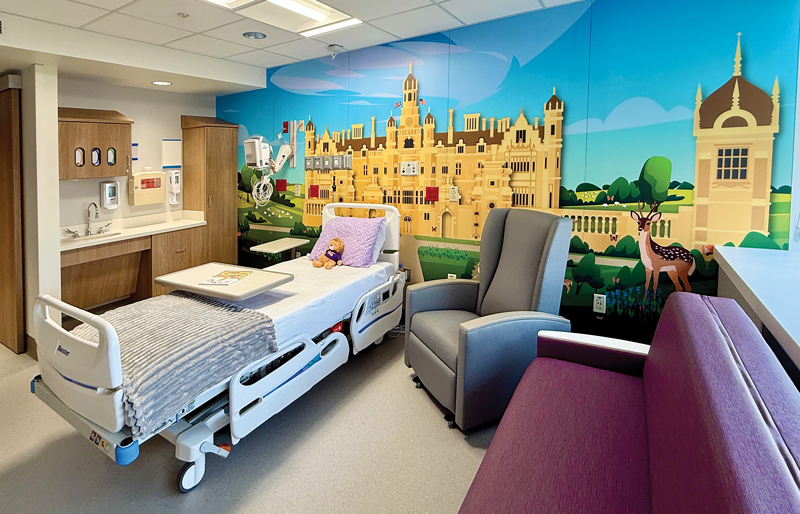 Five of 10 rooms have been renovated, with eight fully funded thanks to donations to the health system’s foundation. Discussions started in 2017 to make the rooms more child-friendly, following in the steps of PMCH’s partner facility in Indianapolis. Plans for the sports-themed first room, sponsored by the Ted & Clare Ziemer Society, began in 2022. Donations from the foundation’s 2023 Cornette Ball funded a fairytale room with fairies, knights on horses, and dragons. Hafer developed the donor-chosen themes — PMCH ensures each plan meets clinical standards for patients and staff — and Danco Construction completed updates by August 2024.