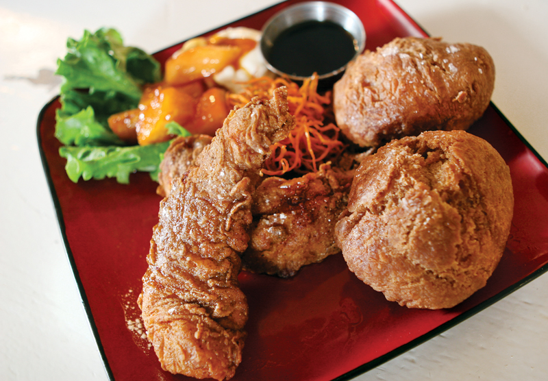 One dish served only during brunch is Chicken and Doughnuts. An obvious twist on the Southern tradition of chicken and waffles, Chef Matt Camp (also known as a guitarist for the local band Blame the Radio featured in the January/February 2013 issue of Evansville Living) looks to create “grown-up” versions of classics, and this is no exception. Hand-breaded fried chicken strips are joined by two large homemade doughnuts, sweet potato straws, and caramelized cantaloupe, and is served with bourbon maple syrup and brown sugar crema. The combination of savory and sweet keeps you coming back bite after bite.