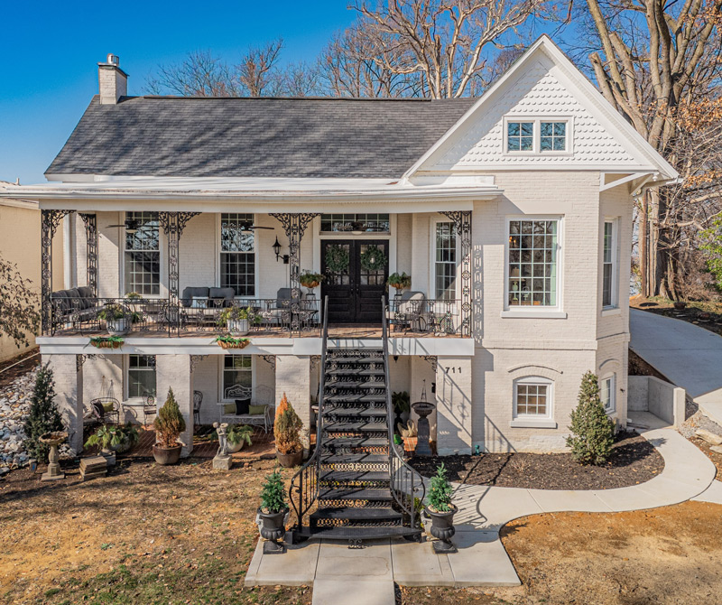 Keeping key historic features was always a priority. She retained the wide-plank wood floors, dining room chandelier, and woodwork around doors to reference the past. The exterior was enhanced by adding newly designed sidewalks and a driveway cut into the hill to the garage, but the ironwork also was important. Banna added front stairs and railings that provide a way to enter the house at the top, main level — something that had not existed for decades.