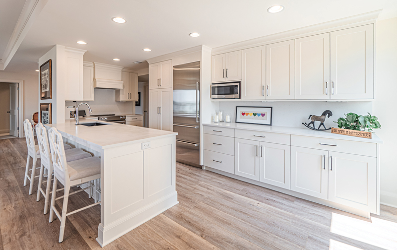 They started by narrowing and opening the southeast wall between the kitchen and dining room to let the gathering areas breathe. After cutting overhead holes, they found that, by shifting some ductwork, they could raise the ceiling about 16 inches. The new open-concept kitchen and dining room features custom-built Fehrenbacher Cabinets and bar seating, plus a a beverage cabinet hidden behind motorized shutters. To simplify design options and open up spaces, they chose to paint the entire condo the same clean white. “We did go with all one color, which some people would not like,” McClintock says.