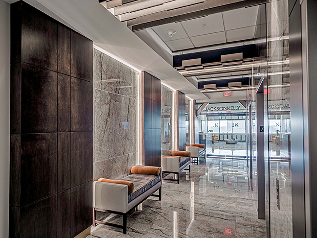 Long used for storage and little else, the Fifth Third Center’s seventh story would need vision and substantial financing to become state-of-the-art law firm offices. The build-out took a full 18 months, but Jackson Kelly’s 16 local attorneys and 20 staff members now practice in a space that might rival any other in the city.