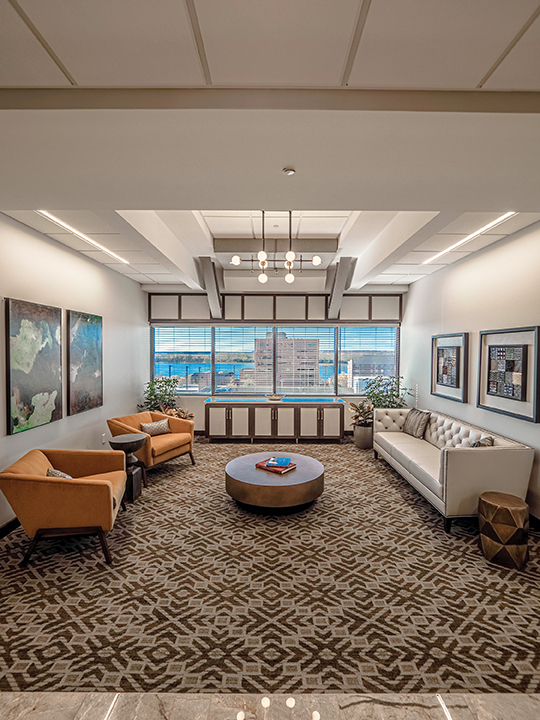 “There seems to be a unique experience upon entering the new space and viewing the beautiful vistas of our riverfront city,” Parker says. “I think it sub- consciously encourages us to maintain the high level of professionalism and quality for which the firm is known.”