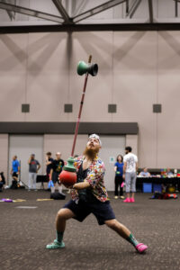 “My brother was learning, so I decided to copy him,” Lampe says. “For about a decade, it was me juggling solo and teaching friends. And in college, I met other jugglers, and they taught me more fun new trucks, like how to pass clubs, which is now my favorite thing to do. And then I started coming to festivals and met the community.”
