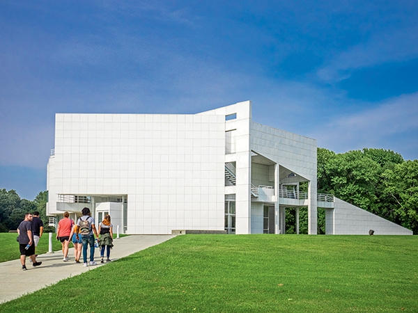 The project began with Jane Blaffer Owen, wife of Robert Owen’s descendant Kenneth Dale Owen. Jane was spending personal funds to preserve and grow the town of New Harmony but wanted to establish a group to continue these efforts. She invited Ralph G. Schwarz to head Historic New Harmony, Inc. Together, they continued to shape New Harmony into a modern and historic utopia. They wanted a building that would serve as a welcome center and encapsulate the spirit of New Harmony’s persistent innovation and advancement into the future, so they commissioned Richard Meier and Partners Architects LLP to create this vision.