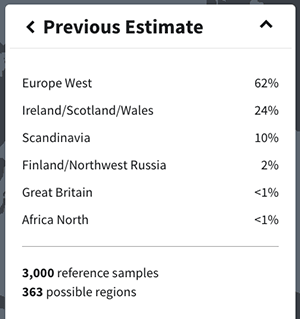 The revised estimate puts me at 64 percent England, Wales, and Northern Europe — a pretty big territory on the Ancestry map. Ancestry DNA does recognize France and Germanic Europe as distinct regions making it not likely that my father’s family was “Pennsylvania Dutch” (German?) as my Granny like to say. Of course, she also told us she was Native American!