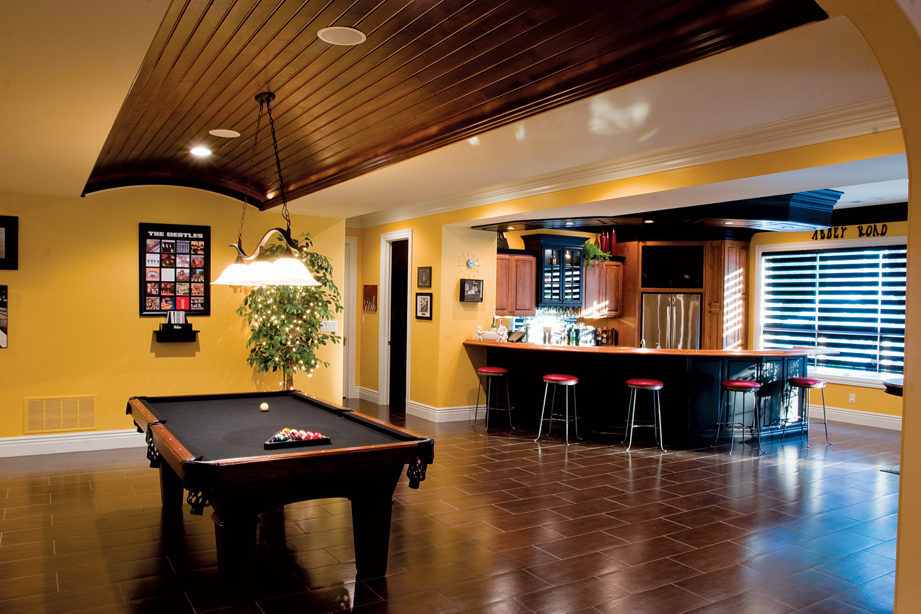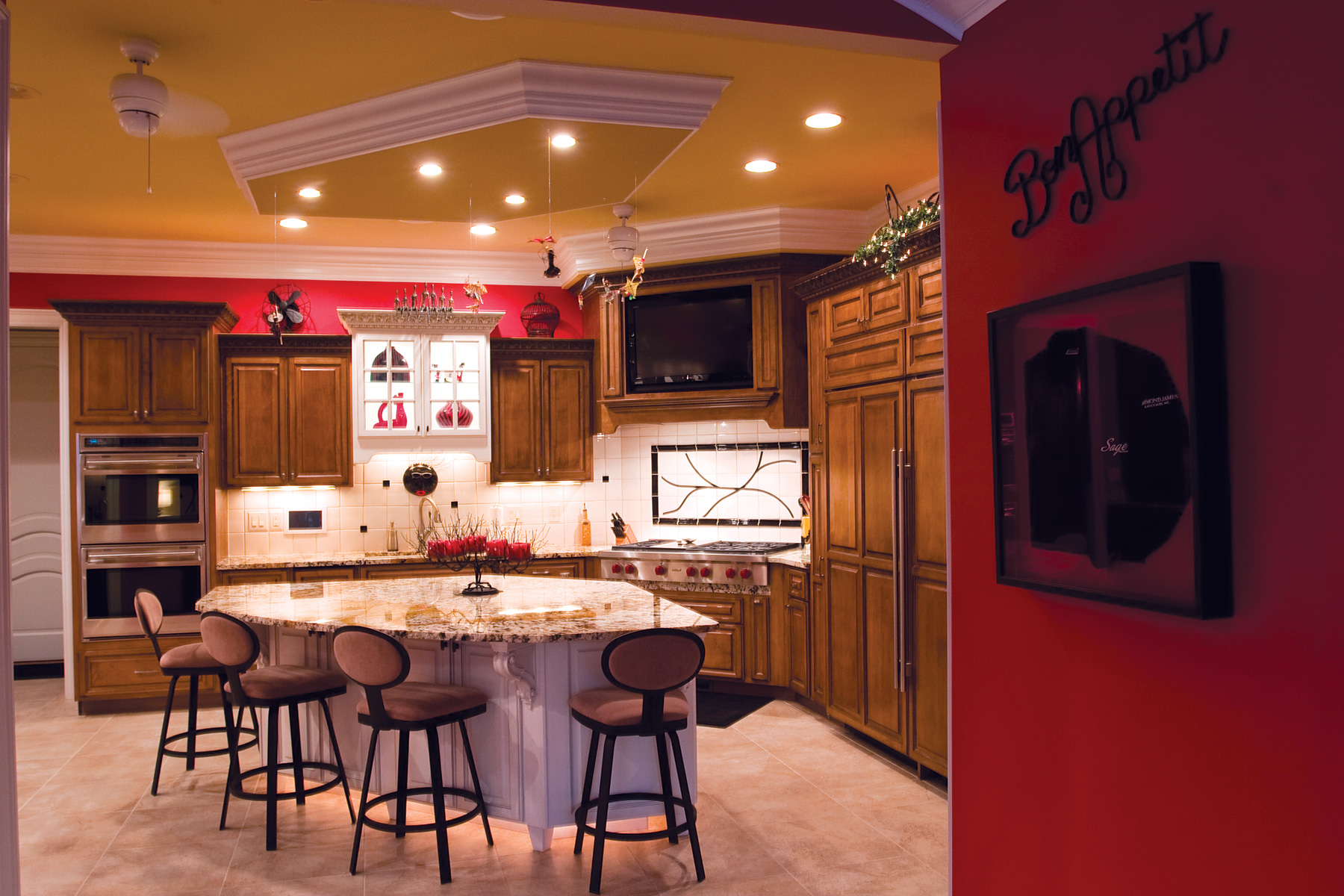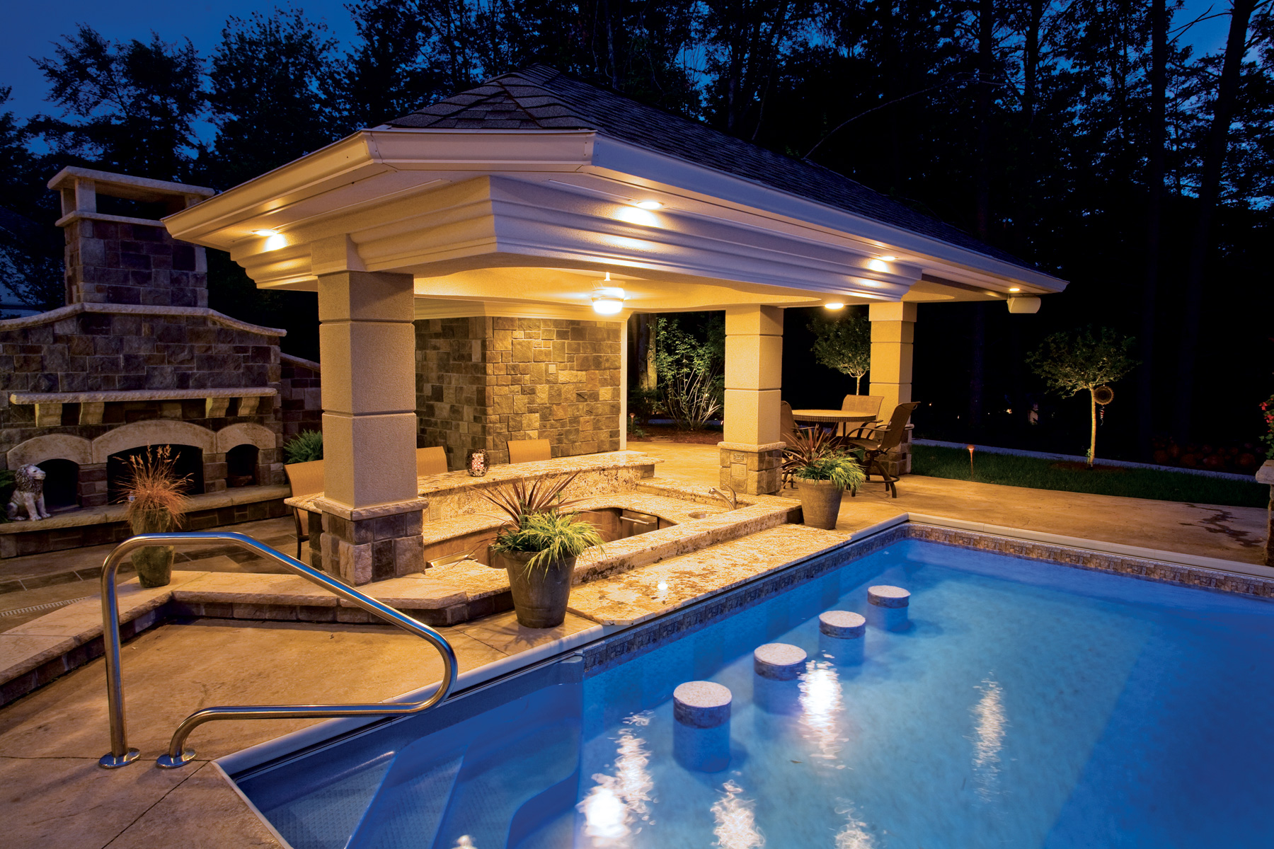 Surely winter is a distant thought for the Carsons, as they enjoy their second summer relaxing at their backyard pool pavilion. Design elements from the home are incorporated into the outside living space, including a wavy coffered ceiling above the pool deck and abundant use of granite and stone (from Interstate Stone Supply, Newburgh, which also provided the unique granite inside the home). The sports pool features a swim-up bar, served from the full-service poolside kitchen.