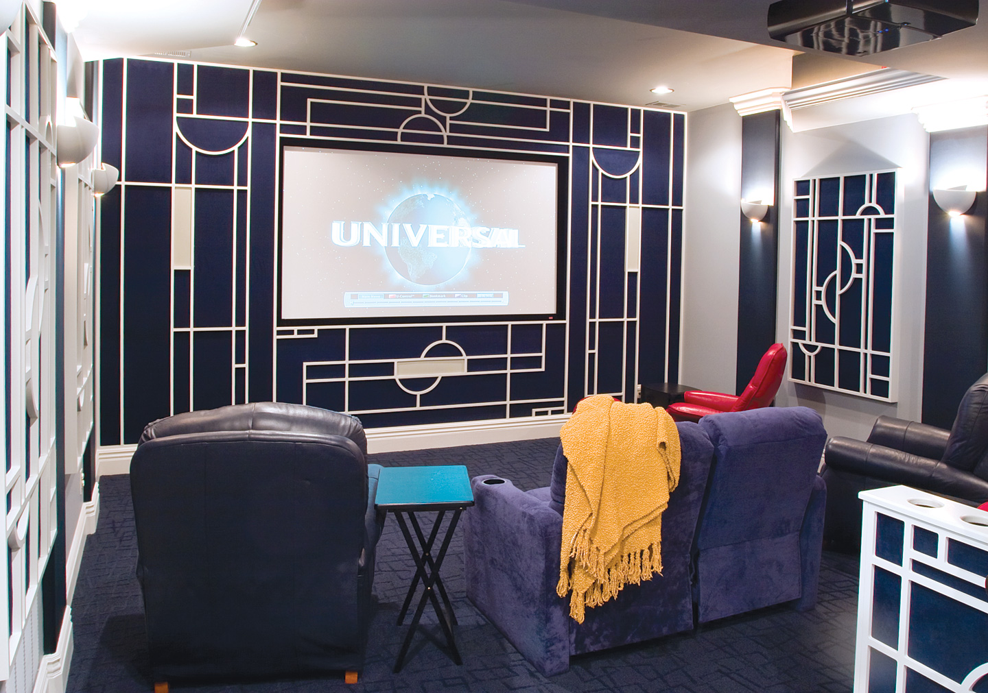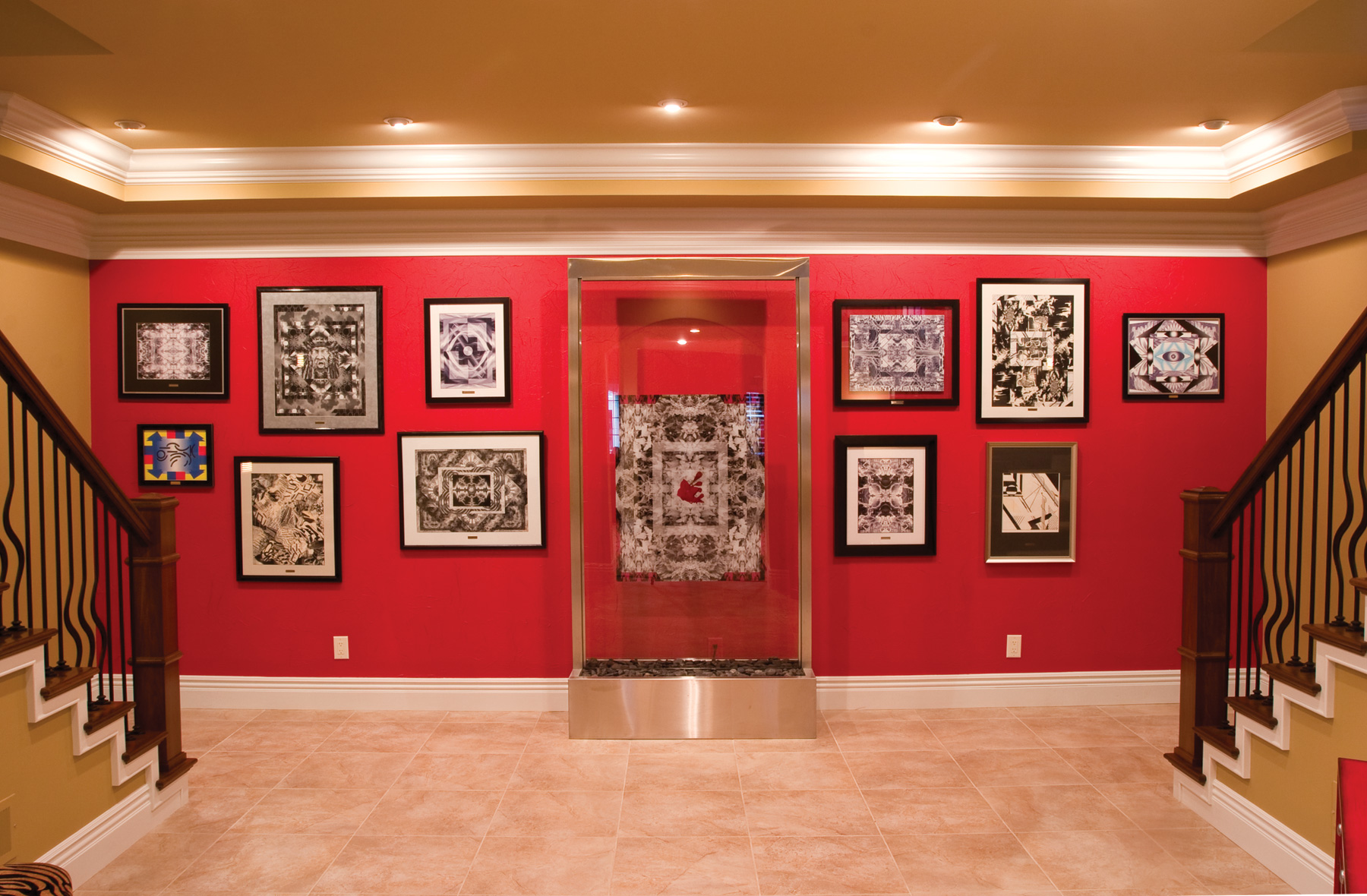 Personal touches abound in the home that was furnished and outfitted from local sources, travel finds, and Internet resources. The centerpiece of the downstairs landing is a water wall and mixed media art installation by Vicky’s son Michael Weber, an artist living near Orlando, Fla. Dave describes his art as utilizing “overlay, mapping, and mirroring.”