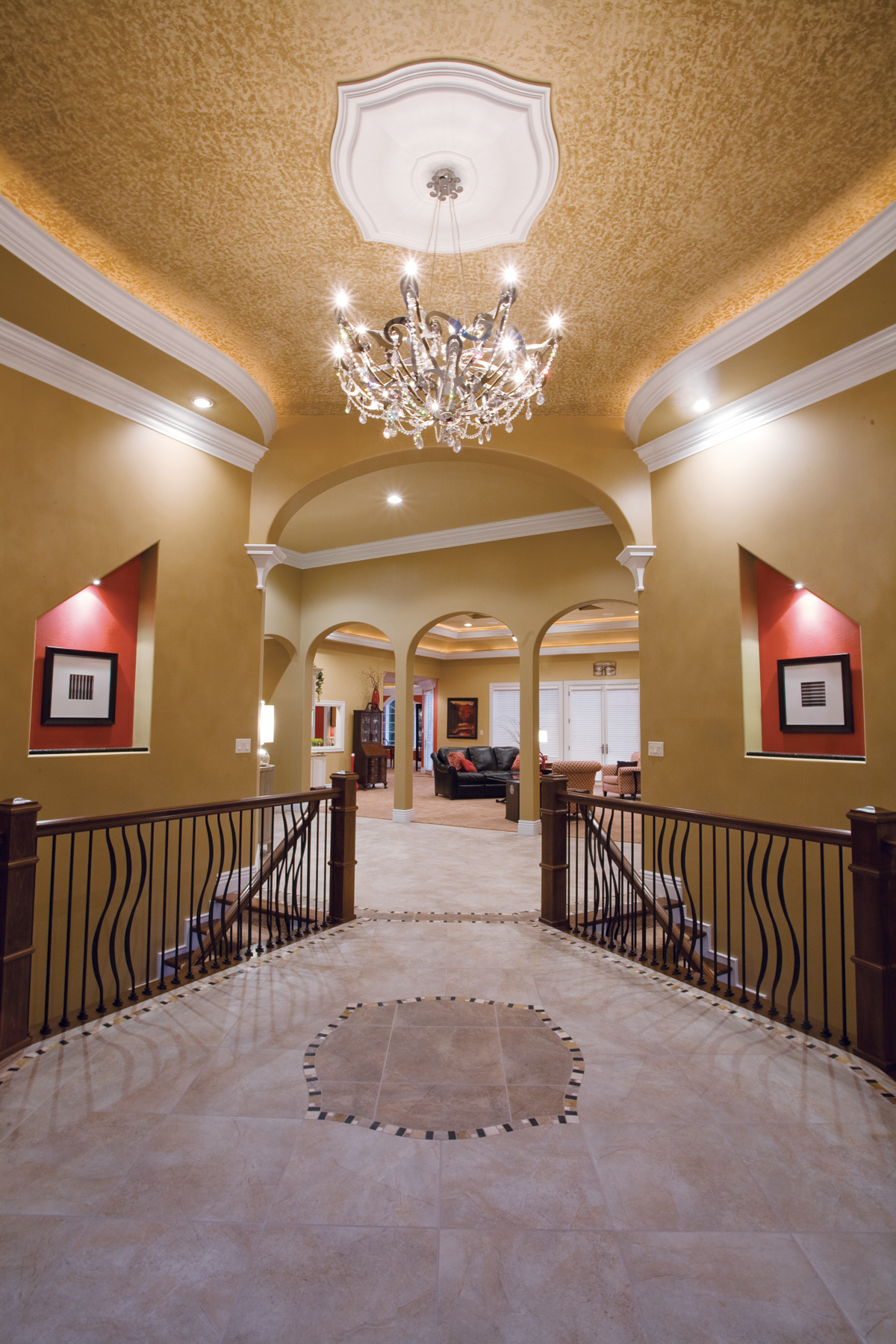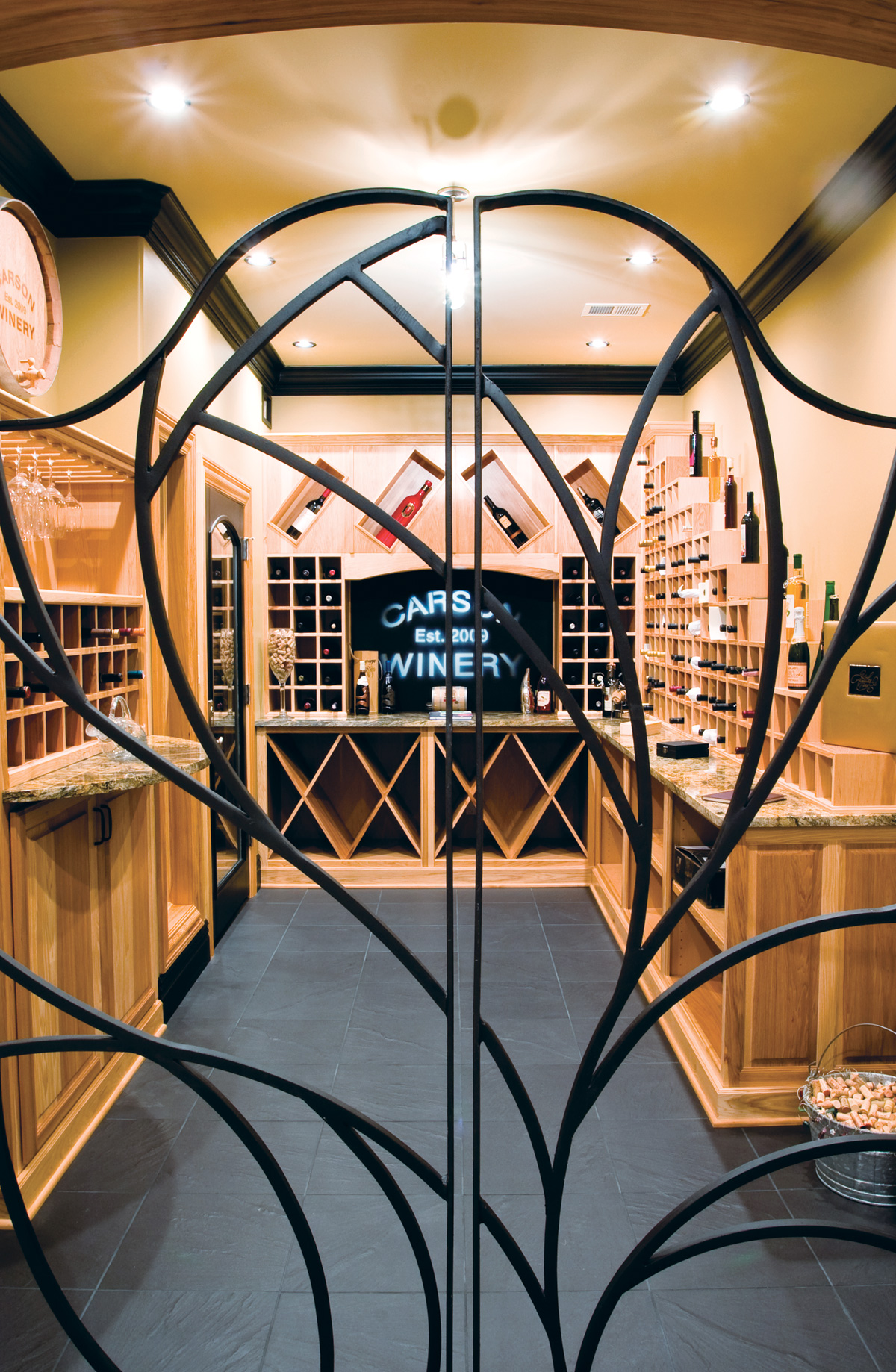 Ceilings in the home are 14 to 16 feet high and incorporate intricate coffering researched and designed by Dave and engineered by Sheffer. Similar curvilinear patterns are revealed on the portico to the home, the front door, and flanking windows, as well as in intricate ironwork (by Chester’s Iron Shop in Evansville) in the kitchen and wine cellar.