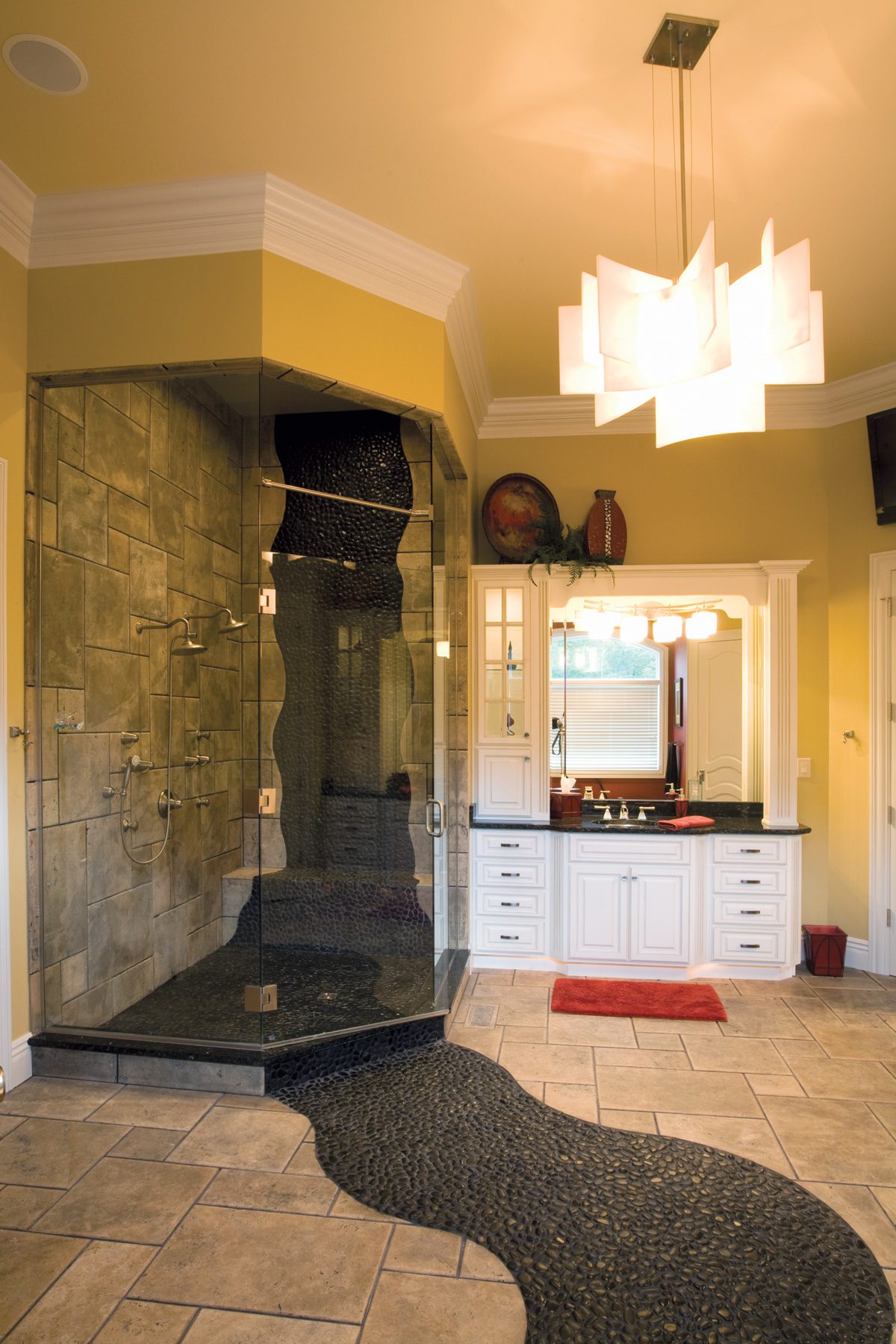 Vicky derived much of the inspiration for the home from travels with her husband and from an idea folder she maintains. “I like what I like,” she says. “I like a mix of things.” A hairdresser early in her adult life, over the years Vicky has developed, her husband says, “her hobby of making unique crafts for events, special occasions, and our home.” (A large and well-appointed craft room on the lower level provides Vicky the space she needs for her crafty side.)