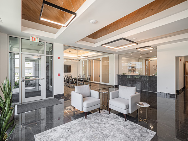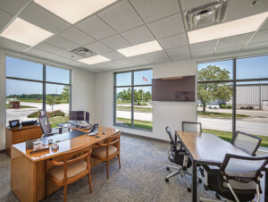 Meanwhile, Sandy’s former career as a residential builder shows throughout the interior, including the new logo and signs. Two conference rooms with cypress-paneled ceilings flank the reception area, where the Joneses’ daughter, Jodi Powell, works as the administrative assistant. Beyond is a sign displaying Danco’s new logo, replacing the previous circular design with one defined by a capital “D.”