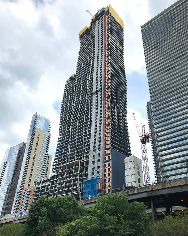 Currently rising along the south bank of the Chicago River’s main branch, the 1,198-foot Vista Tower is posed to become the city’s third tallest building, after the Willis Tower and the Trump Tower. (It’s completion will push the AON Center, formerly known as the Standard Oil building and the Amoco Building, to fourth tallest in the city). When it opens in 2020 it will house 406 luxury condos, a 192-room five-star hotel, and lots of fancy amenities.