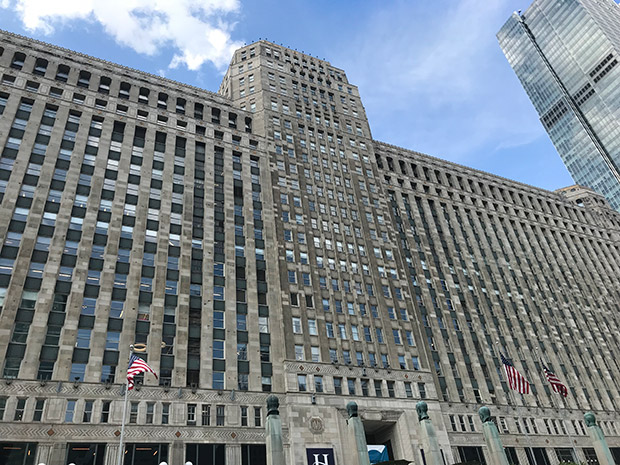 Wendella’s tours depart from the Chicago River right under the Wrigley building, next to the Trump Tower. Note the clock on the tower: Its four faces (pointing each direction) are 19 feet 7 inches in diameter.
