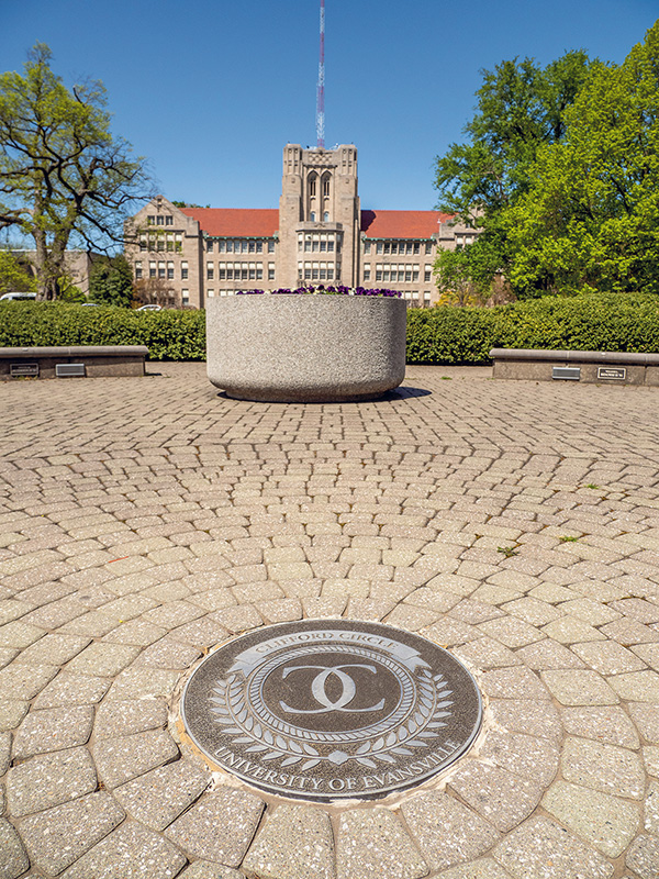 The University of Evansville has a compact campus, but it is filled with beautiful outdoor spaces, including the mysterious Echo Point. Called fondly by its unofficial name, Echo Point is the exact center of Clifford Circle in the Sesquicentennial Oval — UE’s front lawn that faces Lincoln Avenue.