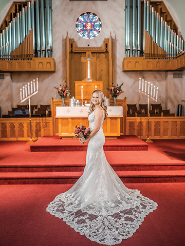 Their ceremony took place at Bethlehem United Church of Christ, the home church of Scott’s family for six decades. The sanctuary was adorned with floral aisle decorations and altar displays. A string quartet from the Evansville Philharmonic played the prelude, while the church organist provided the bridal march.
