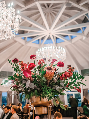 The reception at Rolling Hills Country Club in Newburgh, Indiana, was a formal affair, with a black-tie optional dress code and plated meal. The dance floor, centrally located in the banquet hall, was surrounded by tables featuring fresh floral designs. “It is extremely tough to beat a sunset at RHCC,” Scott notes.