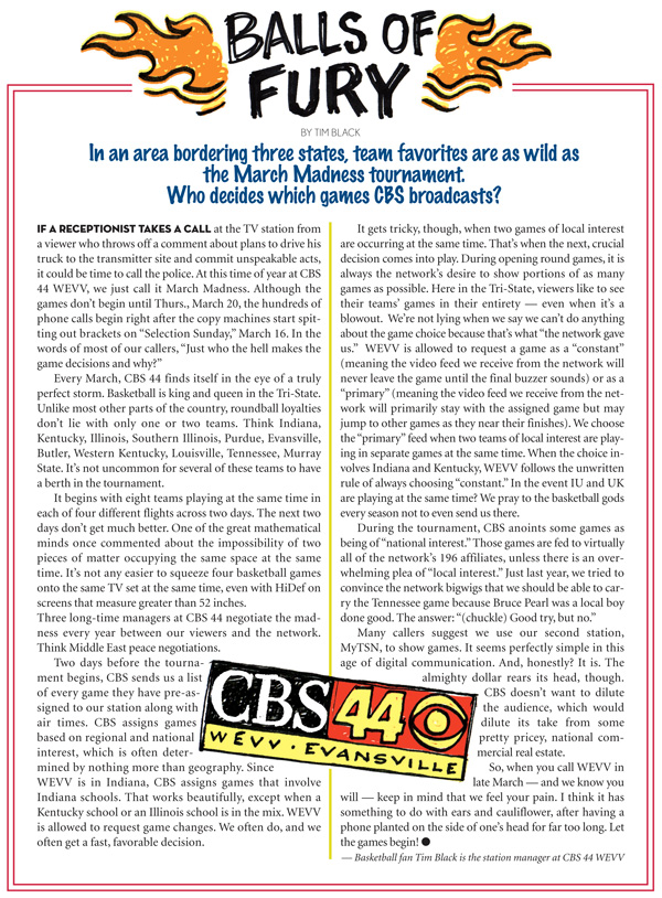 If a receptionist takes a call at the TV station from a viewer who throws off a comment about plans to drive his truck to the transmitter site and commit unspeakable acts, it could be time to call the police. At this time of year at CBS 44 WEVV, we just call it March Madness. Although the games don’t begin until Thurs., March 20, the hundreds of phone calls begin right after the copy machines start spitting out brackets on “Selection Sunday,” March 16. In the words of most of our callers, “Just who the hell makes the game decisions and why?”