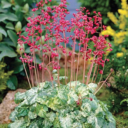 Heuchera “Green Spice” has a striking leaf with a green edge and a silver middle with red veins. It has a pink flower and tends to be shade-tolerant.
