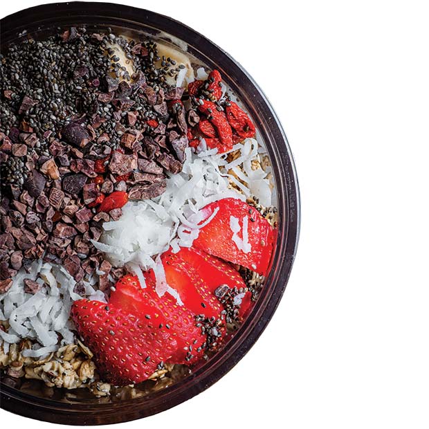 The $9.95 bowl is layered with a stack of ingredients that form a crunchy balance of sweet and rich natural flavors. Starting with an acai berry mixture covered by a heap of hemp hearts organic granola and almond butter, the bowl is topped off with sliced strawberries and bananas, rehydrated goji berries, cacao nibs, chia seeds, and shredded coconut.