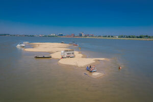 Evansvillians display their ingenuity during the annual dredging of the Ohio River. Boaters circle the U.S. Army Corps of Engineers’ pumping operations like moths around a flame, ready to jump on the sand-laden island that springs to life. The novelty of a white-sand beach in the middle of the river is too much to resist, and the island attracts recreationists for swimming, sunbathing, and picnicking each day of its short-lived life. This year, a prankster upped the ante by hauling a camper onto the island in the dead of night, enshrining it with a delightfully vulgar name, and then leaving it to eventually be overtaken by a rainwater-swollen river — much to the consternation of authorities. As it sank, the “saloon” was celebrated by irreverent boaters and followed by a curious public via a 24-hour “camper cam.” Its story, like the island, was brief, but its time in the spotlight was endless and notorious.