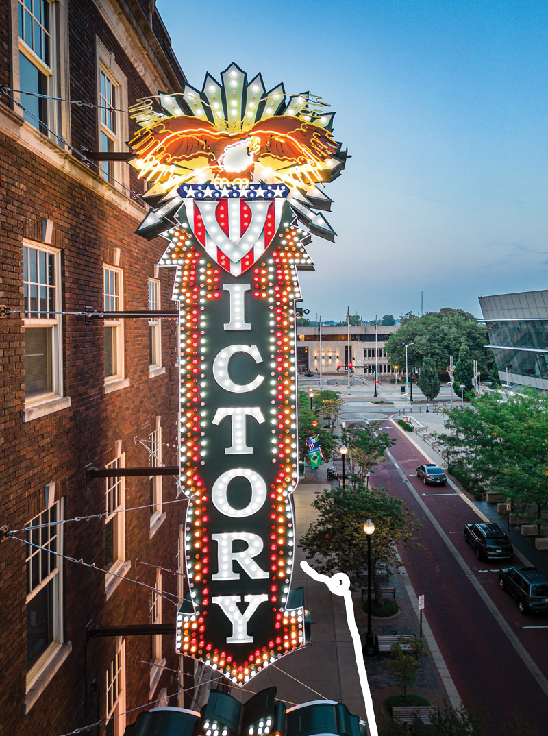 It was quite a party Aug. 11 in Downtown Evansville as the Victory Theatre’s new marquee was lit for the first time. Following remarks by Lt. Gov. Suzanne Crouch and Mayor Lloyd Winnecke, a countdown scrolled across the LED message board, and the few hundred people gathered outside the 102-year-old theater cheered as the lights glowed. Installation of the vertical blade-shaped marquee was a two-decade endeavor by theater manager VenuWorks and the nonprofit Friends of the Victory. Evansville Living editors love the look, too, and call it a grand “victory” for Downtown. Read more about the Victory’s new marquee on page 192.