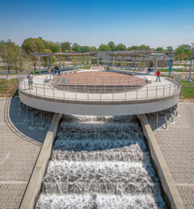 Water and sewer projects typically don’t conjure images of beauty, but this addition has lent some sparkle to the riverfront. Evansville Water and Sewer Utility’s $60 million effluent pump station opened in April and returns treated water to the Ohio River in a bubbly cascade that passersby can admire from an observation deck. Down a rolling hill at the glass-fronted indoor facility, visitors have an unobstructed view of the water testing and delivery process. The pump station and cascade won the 2023 Aim Community Placemaking Award in August from Accelerate Indiana Municipalities for its efforts marrying function, design, and community engagement.