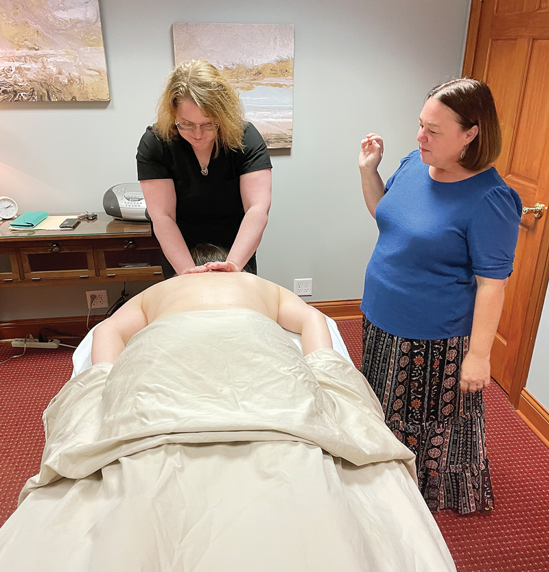 Each term typically accommodates 6-10 students. After a dip in enrollment during COVID-19, numbers have been rising. Approximately 450 students — nearly 100 percent who have enrolled — have graduated since the institute was founded in 2000 and gone on to work at spas, physical therapy and chiropractic practices, and even on cruise ships. Martin says student demographics have evolved to feature more male and gender-diverse students ages 25-55. Martin and Axton add that many students are pursuing massage therapy as a second or third career or “have attended college and felt that the college-career path was just not right for them,” Martin says.