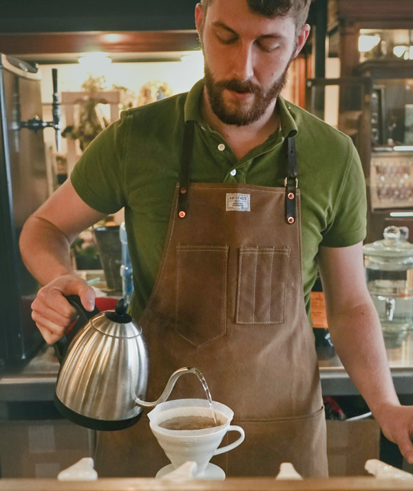 “Every cup is made to order,” says Madson, who has been running the traditional coffee cart located in The Bitterman Shoppes & Farmer’s Market, 204 Main St., with his wife Lillie Madson since February. “You can choose from our seasonal collection of 15 types of Sunergos Coffee (of Louisville, Kentucky) beans, and I grind the bean to a specific size, heat the water to a specific temperature, and slowly pour the water over the grounds to let them bloom and extract for about two to three minutes.”
