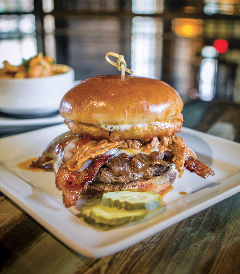 Smokin’ BBQ: A pile of the namesake of this burger — pulled-pork covered in BRU’s honey chipotle barbecue sauce — adds another layer to this masterpiece.