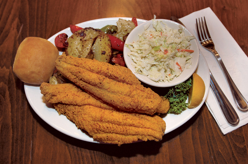 As a Boonville native and a Logsdon’s regular, I frequently dine on the catfish filet sandwich ($8.95) — served on a hoagie bun and topped with homemade tartar sauce, a pickle, and onions — for a Saturday lunch. On evening occasions, the catfish filet dinner ($16.95) arrives with two heaping 7-ounce filets garnished with lemon wedges, two side items, and a semi-sweet dinner roll. Logsdon’s offers plenty of hearty side options such as baked beans, mashed potatoes with gravy, rice, twice baked potatoes, potato salad, and more. I opted for creamy coleslaw and German potatoes mixed with red and green peppers and onions. Each filet is lightly hand breaded with spices, yet not greasy, and has a bright white interior that’s tender enough to cut with a fork.