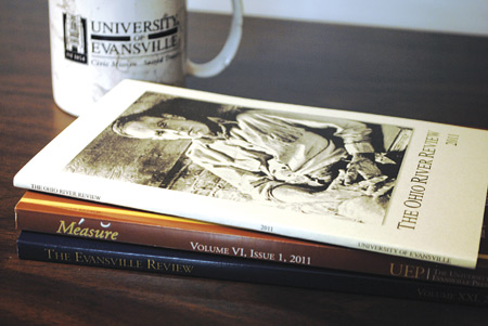 Meanwhile, another team of UE students publishes The Evansville Review under Baer, and a small number of interns help Bone and Rob Griffith, associate professor of creative writing, produce Measure. While The Evansville Review exhibits a variety of genres, Measure is dedicated to poetry. Both journals serve up the finest efforts of national aspiring writers. “You want to find the best work you can,” Bone says. “It’s not that so much stuff is bad, but really good stuff is so rare.” Less than 10 percent of submissions to Measure are accepted.