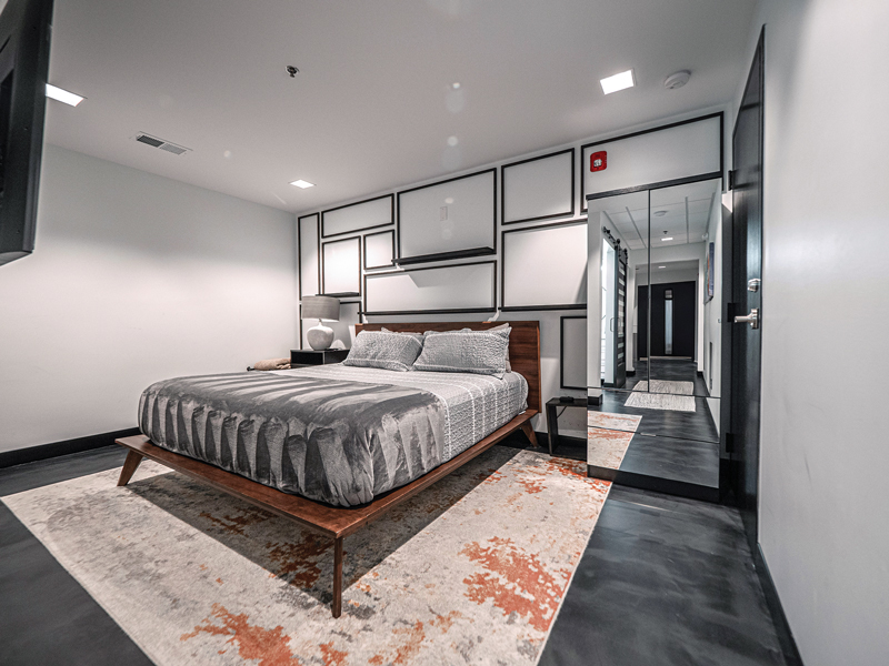 The studio is equipped with a full kitchen featuring stainless steel appliances and quartz countertops. A hallway leads to the full bathroom and a bedroom with a king-sized bed. The Airbnb includes two televisions with a Netflix and a washer and dryer. Jennifer Scales, interior designer and owner of Y Factor Studios, appointed Ten Adams’ new office space and Airbnb with grays, blacks, and blues to elicit a comfortable, modern feel — much like Downtown’s rejuvenated energy.