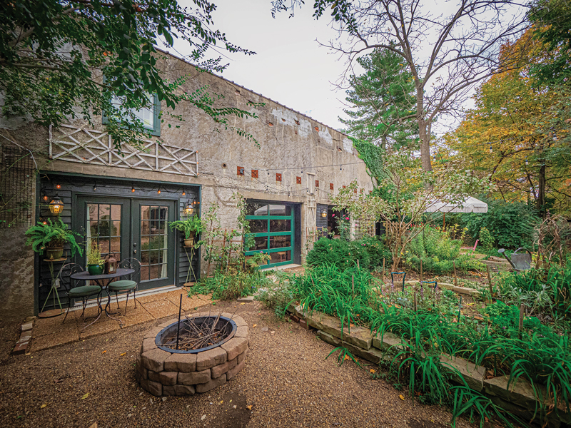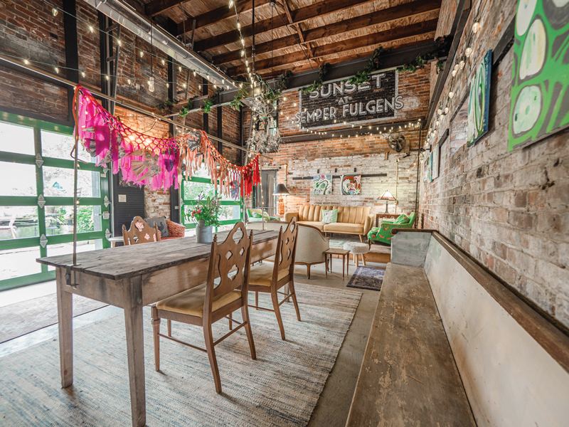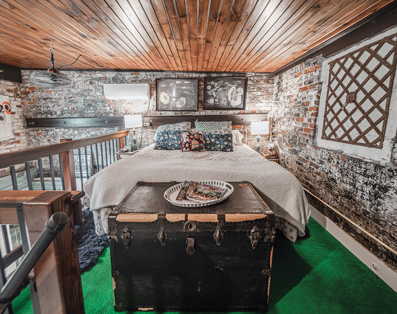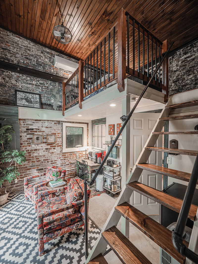 Renovations were required to turn the brick carriage house into the Nest — the second floor was a hazard, upheld only by a giant beam, of which the couple kept pieces for decoration. A bedroom loft was installed above a full bathroom, sitting room with a coffee bar, and patio. Next to the loft is an event space, which visitors have access to.