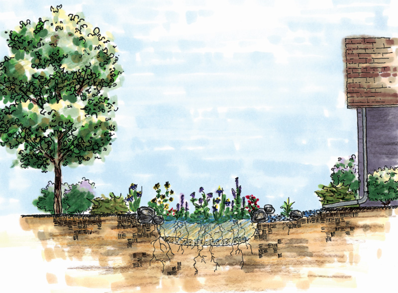 In deciding where to locate your rain garden, consider putting it near a hard surface such as an alley, a sidewalk, a driveway, or under the gutters on your home.