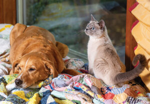 As you might expect, many of our ideas here at the magazine grow organically from personal experiences and take root around our conference table. For inspiration for “Comfort and Joy,” I had only to look out our family room bay window. The window surrounds a cushioned seat and, like most window seats in houses built in the 1920s, covers a storage area. Ours is used for our large stash of quilts of all sizes, patterns, and ages made by my grand- mothers, great-grandmothers, aunt, and cousin. When they are visiting home, just as they did growing up in the house, our sons and their girlfriends make a beeline to the quilts to cozy up while hanging out. The quilts also are a favorite of our pets; they, too, are creatures of comfort. Jed, our 11-year-old Mountain Cur dog, can expertly arrange the quilts himself. Guests, worry not; our quilts regularly get laundered.