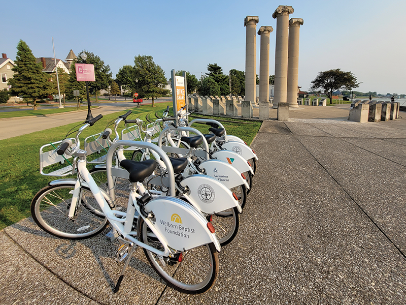 We took a ride on these sleek 3-gear bikes, which are parked at six locations in Evansville and one in Henderson, Kentucky. Started by the Evansville Trails Coalition in 2016, the city-wide rental program is accessible through the BLOOM Bike App and has more than 4,000 program members.