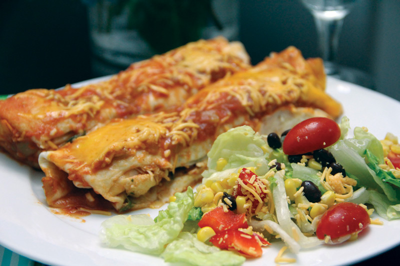 The skinny chicken enchiladas and fiesta salad were healthy, delicious, and filling. After a short, 20-minute bake time, the meal was ready. It was that easy. The salad was fresh: crisp green lettuce, black beans, tomatoes, cheese, corn, and a homemade salad dressing.