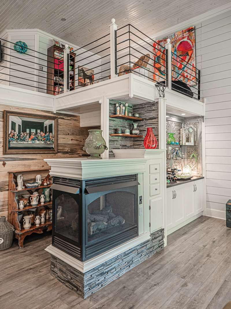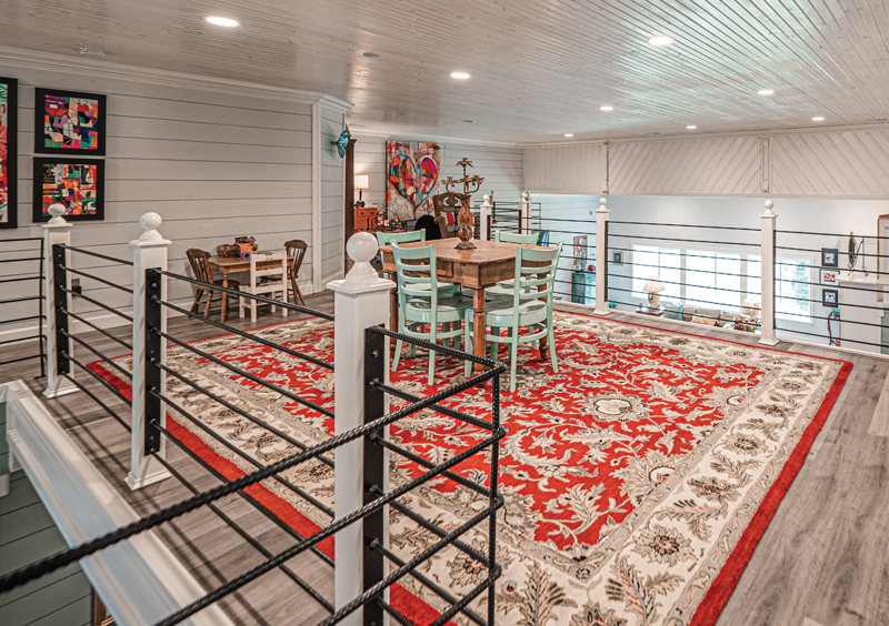 The first floor contains a guest bedroom and Sally’s enclosed pottery room just off the rectangular dining room, which features a low ceiling to accommodate the walkway upstairs. The rest of the first floor gathering spaces are open with up to 16-foot ceilings. There is lots of roaming space, ideal for socializing or movie watching, whether from big comfy seats or beanbag chairs the Kempfs bought for their grandchildren. “We just wanted something really functional to hold everyone, the dogs and kids,” Sally says.