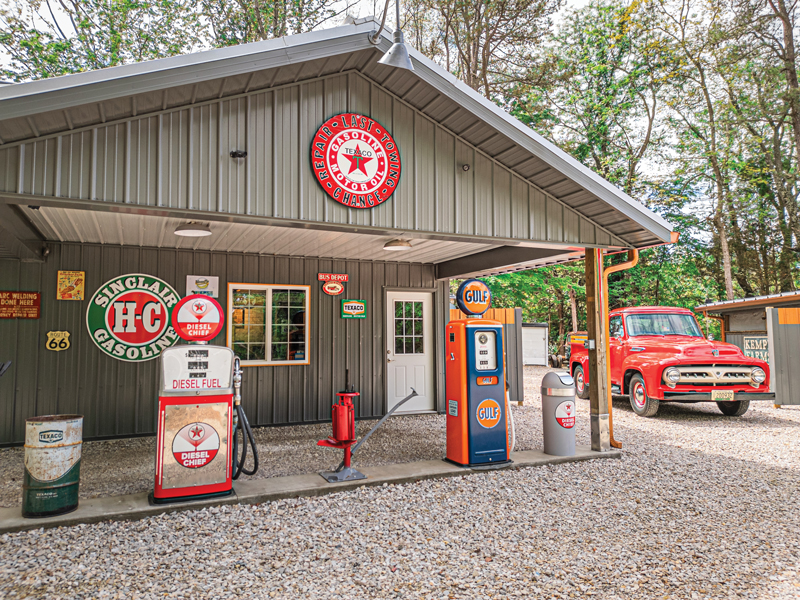 His unattached garage is a vintage gas station, with a welding shop that he uses frequently.