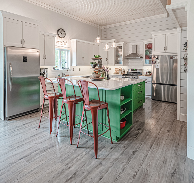 Most of the Kempfs’ living space is unrestricted by walls — when you walk in the front door, you can see all the way to the back windows. Shiplap and some tongue and groove cover the walls. Befitting its setting outside, accents throughout are varying shades of green, from dining chairs to kitchen drawers to steps in the staircase. “I guess I’m a green freak,” Sally says. Kitchen cabinets were crafted by Allison Quality Woodworking; owner Clay Allison is a longtime friend of Todd.