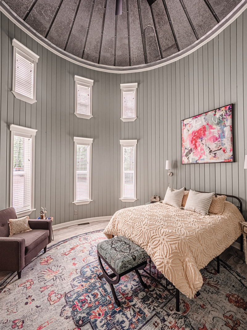 The bedroom has long vertical windows. Towering above are a ceiling and roof with 2-feet-thick foam insulation packed between them. Inspiration for the tall, circular design came from Todd’s heart. His father, the late Gregory Kempf, founded Empire Contractors (initially known as Empire Steel), but he also worked as a grain salesman. “I did that (the silo shape) to honor him,” Todd says.