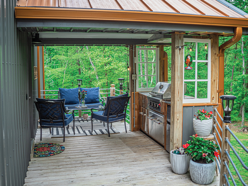 The Kempfs love their picturesque, natural setting, which abuts the surrounding forest-like area. They playfully call it Poison Ivy Park, but there really isn’t much poison ivy, they insist. “The kids call it Narnia,” Todd says. A large wrap-around porch is complete with a slide to the ground. On that level, there’s a large play structure and places to sit and eat or chat. Todd’s meat smoker, which he repurposed from a metal trash bin, stands ready for its next cookout. Sally added a creative flair by fashioning a sculpture with wine bottles and metal piping.