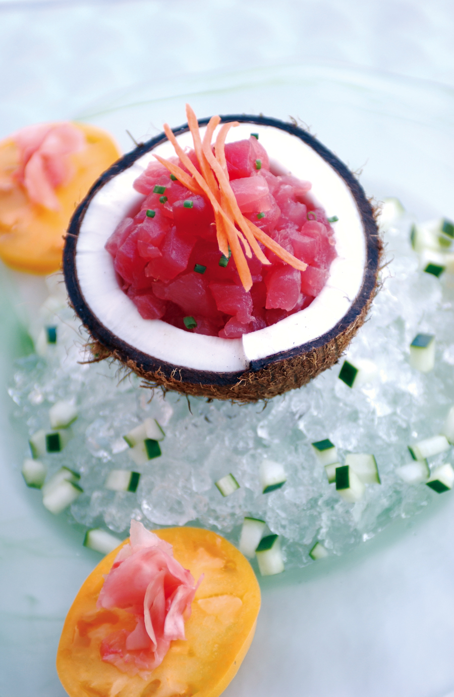 We started with Ostiones a la Lamas — a dish of oysters, spinach, smoked bacon, green chile crema, and manchego cheese baked to perfection. For our seviche, we chose a daily special: the wasabi-glazed seared salmon. The signature seviche is the ahi tuna with seasame, scallions, and ginger served in a fresh coconut.
