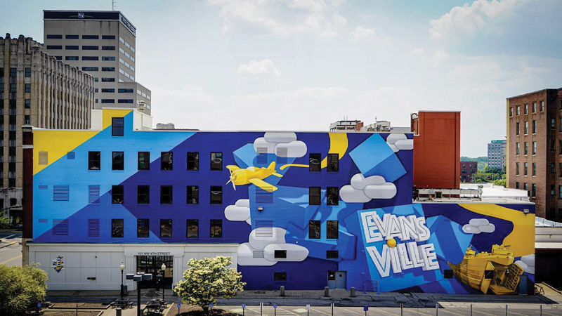 If you’ve recently driven past Old National Bank’s building at the corner of Fourth and Sycamore streets, you’ve likely noticed a bright and bold new mural livening up the Downtown Evansville landscape.