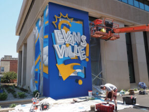 Painted in the lower right of the mural is the word “Evansville” in large, bulging letters. Jeremy L., one of five artists with Often Seen Rarely Spoken, says the letters were created in virtual reality, a new technique of designing digitally.