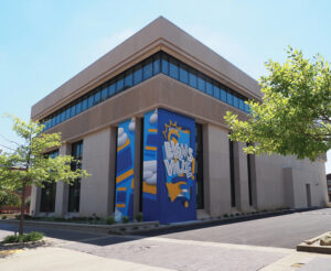 The mural features two Evansville icons: the P-47 Thunderbolt “Hoosier Spirit” and LST-325. Its blue and gold color scheme matches ONB’s branding.